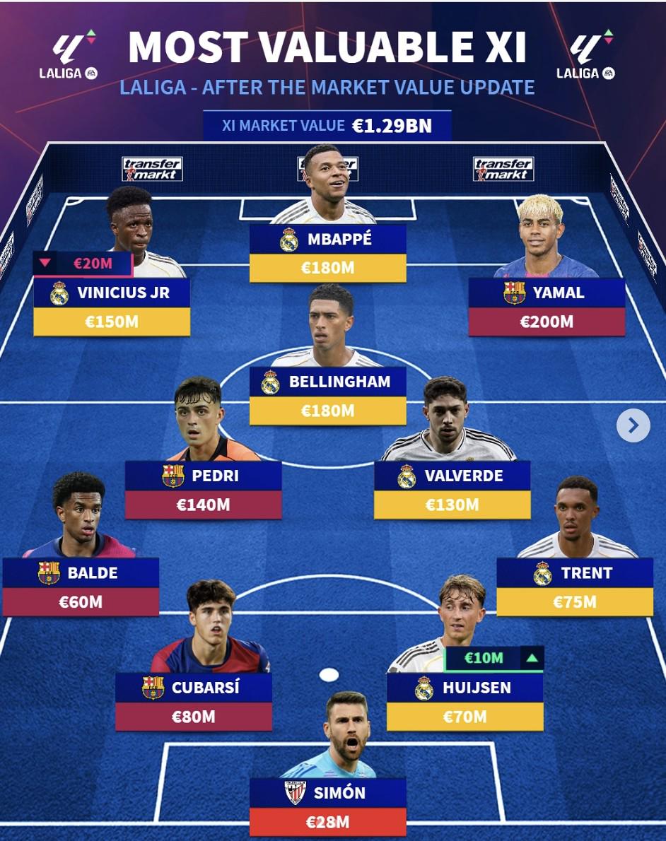 本赛季西甲最贵阵容:亚马尔2亿欧领衔,皇马入选6人,巴萨入选4人