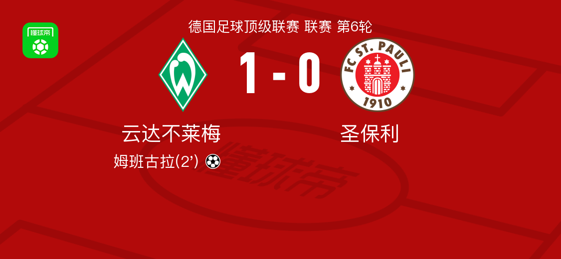 云达不莱梅1-0圣保利,姆班古拉打进全场唯一进球