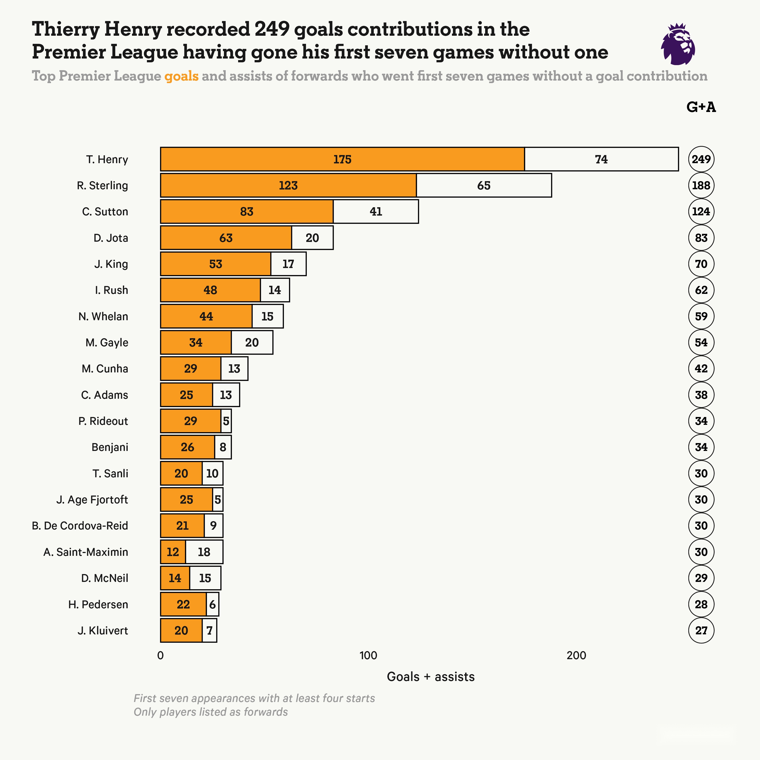 共有75名前锋(为了公平起见,我们排除了中场和后卫)达到了“007”的标准(在他们的前七场比赛中至少首发四次),下表列出了英超总进球参与数排名前20的球员。