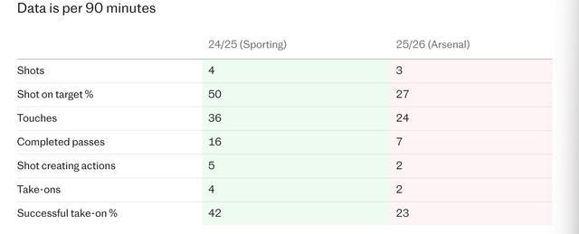 在葡萄牙,他常常通过带球冲击后卫来折磨他们,场均超过4次“向前推进盘带”。而在阿森纳至今,他场均只有1次向前推进盘带 。