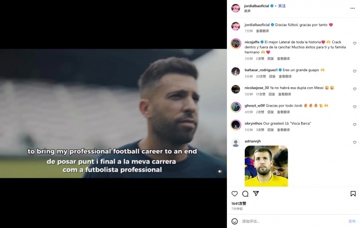 周二,效力于迈阿密国际的传奇巴萨边后卫阿尔巴通过社交媒体宣布将在赛季结束之后退役。在视频中,阿尔巴宣布了自己的决定,并且表示,“感谢足球”。