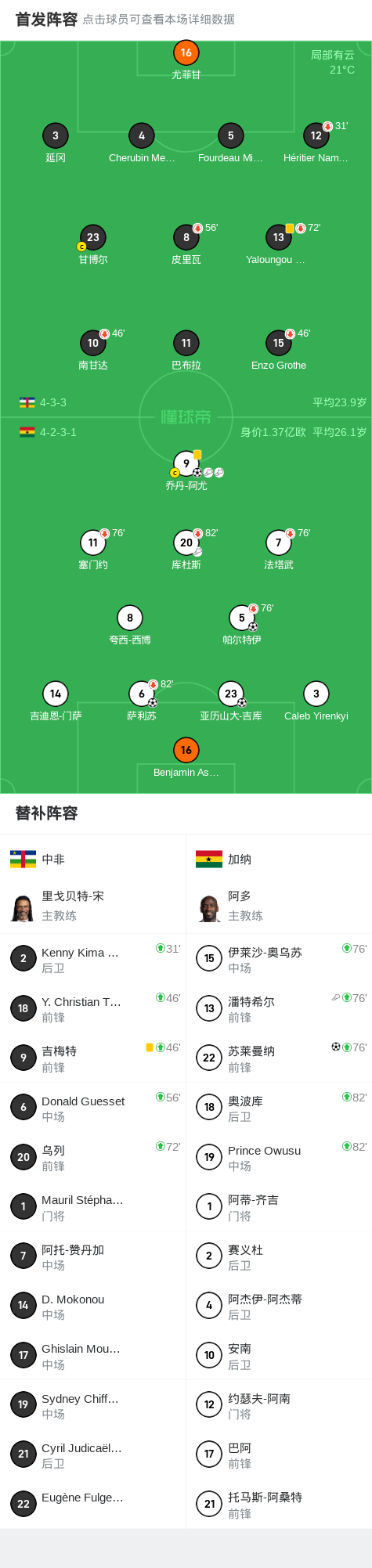 加纳5-0横扫中非,苏莱曼纳破门,乔丹-阿尤2传1射
