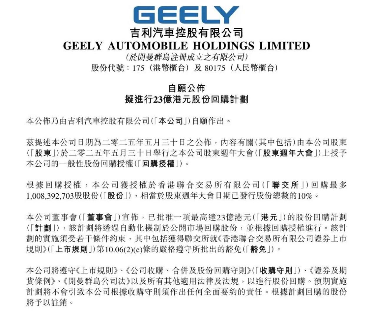 10月6日,吉利汽车控股有限公司(以下简称“吉利汽车”)就正式发布公告,拟推进一项最高规模达23亿港元的股份回购计划。