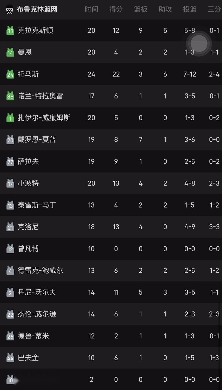 篮网本场比赛共17名球员登场,除双向合同球员泰森-艾蒂安仅登场2分钟外,包括曾凡博在内的16名球员均获得10分钟及以上的登场时间,而曾凡博是这16名球员中唯一一位未能完成出手的球员,也是唯一一位得分、篮板、助攻均挂零的球员。