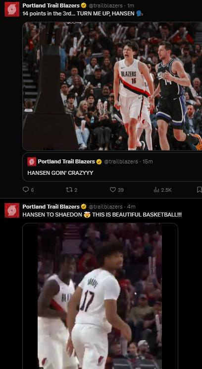 这样精彩的表现也让开拓者官方社媒“为之疯狂”,开拓者官方连续发布三条状态,以称赞杨瀚森的精彩表现。