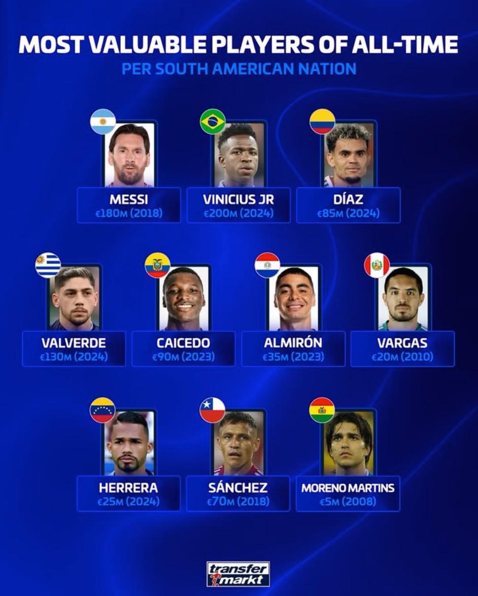 德转列南美各国球员历史最高身价:维尼修斯2亿第1,梅西第2