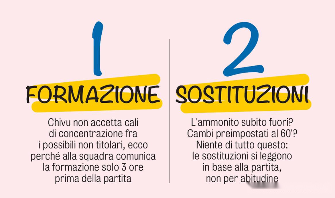 《米兰体育报》以“齐沃的五点变化”为题,指出:一些人因为齐沃没有颠覆小因扎吉的352体系,就认为齐沃只会坐享遗产,但实际上,他的五点做法与小因扎吉完全不同,展示出“严谨治军”的姿态 。