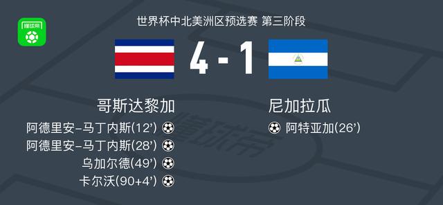 北京时间10月14日世界杯中北美洲区预选赛 第三阶段,哥斯达黎加对阵尼加拉瓜。哥斯达黎加阿德里安-马丁内斯梅开二度,乌加尔德破门,卡尔沃破门。尼加拉瓜阿特亚加破门。最终比分哥斯达黎加 4 - 1 尼加拉瓜。