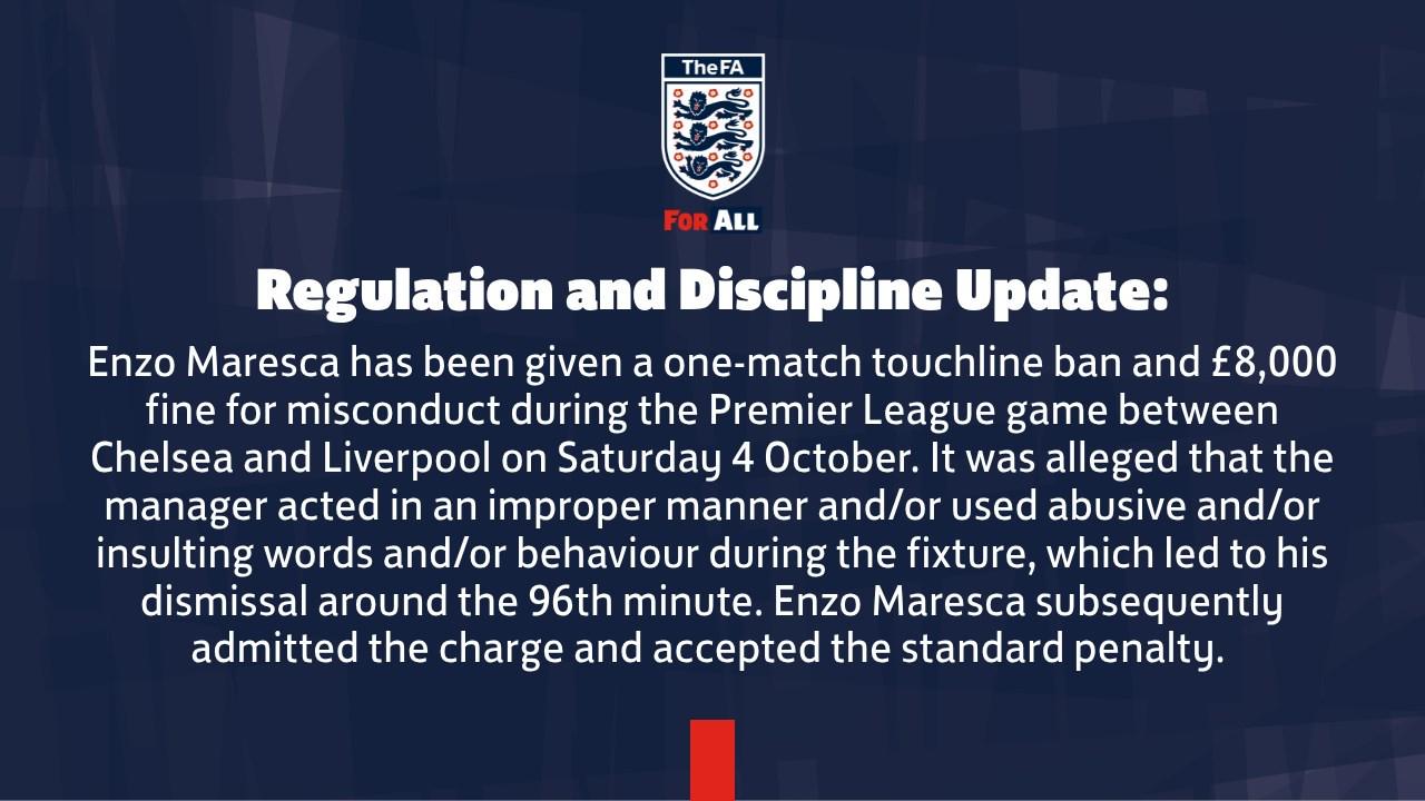 官方:马雷斯卡因对阵利物浦时染红被禁赛1场+罚款8000镑 作者:大赢家编辑部 日期:2025.10.15 北京时间10月15日,英足总官方发布公告,公布了对马雷斯卡的处罚措施,后者在对阵利物浦的比赛中被红牌罚出场外。