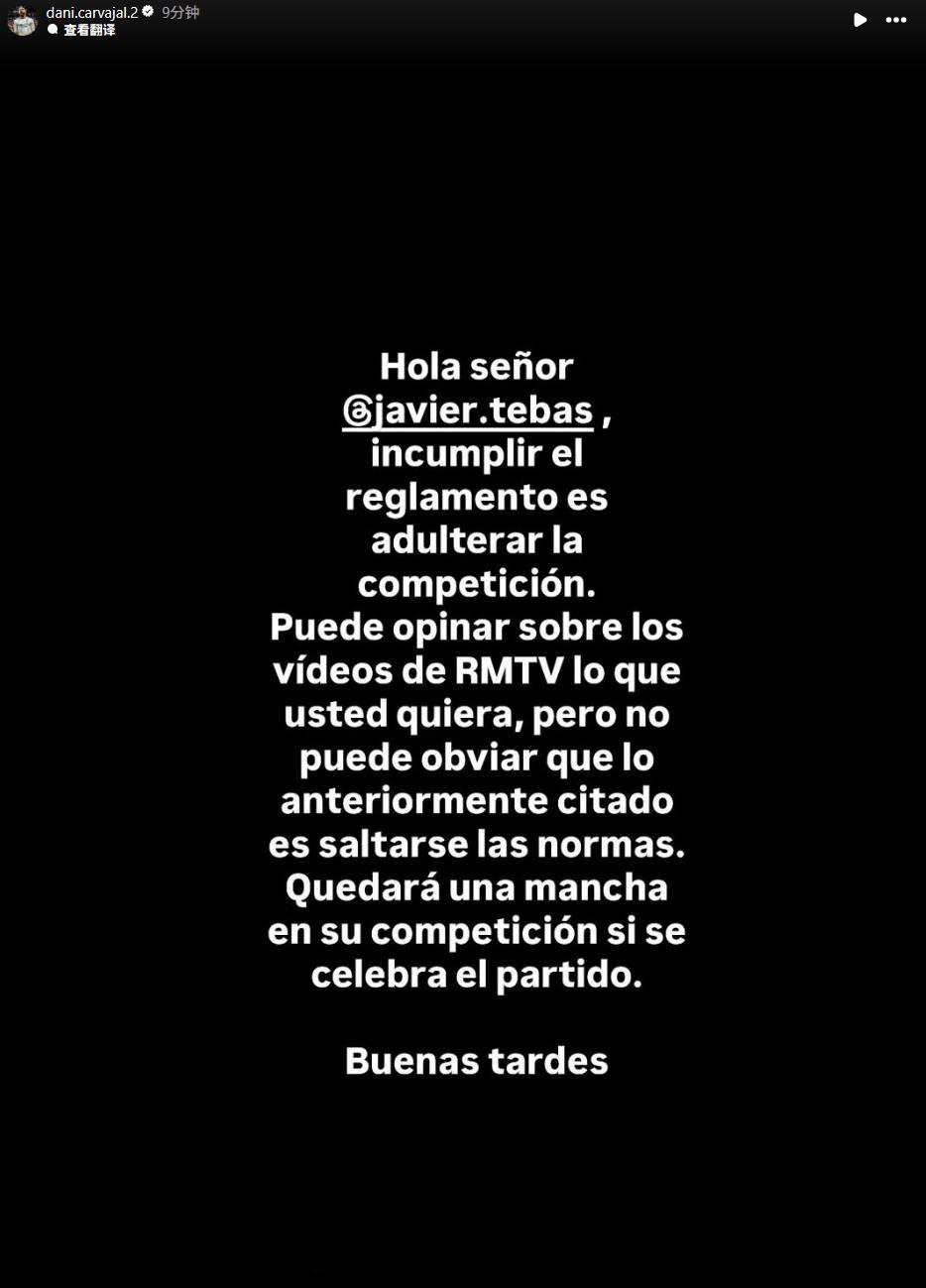 卡瓦哈尔写道:“你好,特瓦斯先生,违反规则就是在扭曲比赛,您可以对RMTV的视频发表任何看法,但不能忽视上述行为是违反规定的。如果比赛如期举行,您的比赛将留下污点,下午好。”