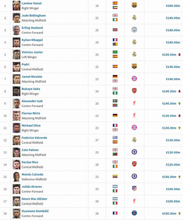 随着英超和德甲球员身价的更新,在德国转会市场身价榜上,目前有18位身价过亿的球员,五大联赛中仅意甲没有球员上榜,登贝莱与凯塞多的身价来到了1亿欧,福登身价跌至8000万欧,罗德里身价从1.1亿欧降至9000万欧。