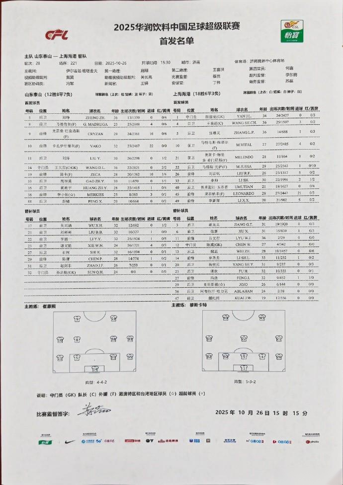 据山东电视台闪电体育消息,山东泰山方面赛前做出了一处首发调整。
