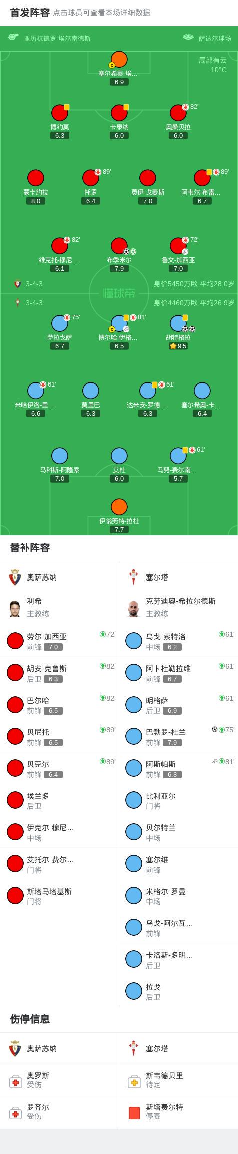 北京时间10月27日,西班牙足球甲级联赛第10轮 较量,奥萨苏纳坐镇主场迎战塞尔塔。比赛中,塞尔塔由博尔哈-伊格莱西亚斯送出助攻,胡特格拉率先破门。随后,布季米尔通过点球为奥萨苏纳扳平比分。上半场补时阶段,鲁文-加西亚助攻布季米尔再入一球,帮助主队实现反超。易边再战,胡特格拉再度建功,将比分再度拉平。此后布季米尔主罚点球未能命中,错失良机。比赛末段,阿斯帕斯送出关键助攻,巴勃罗-杜兰完成绝杀。最终全场比赛结束,奥萨苏纳以2比3不敌塞尔塔。