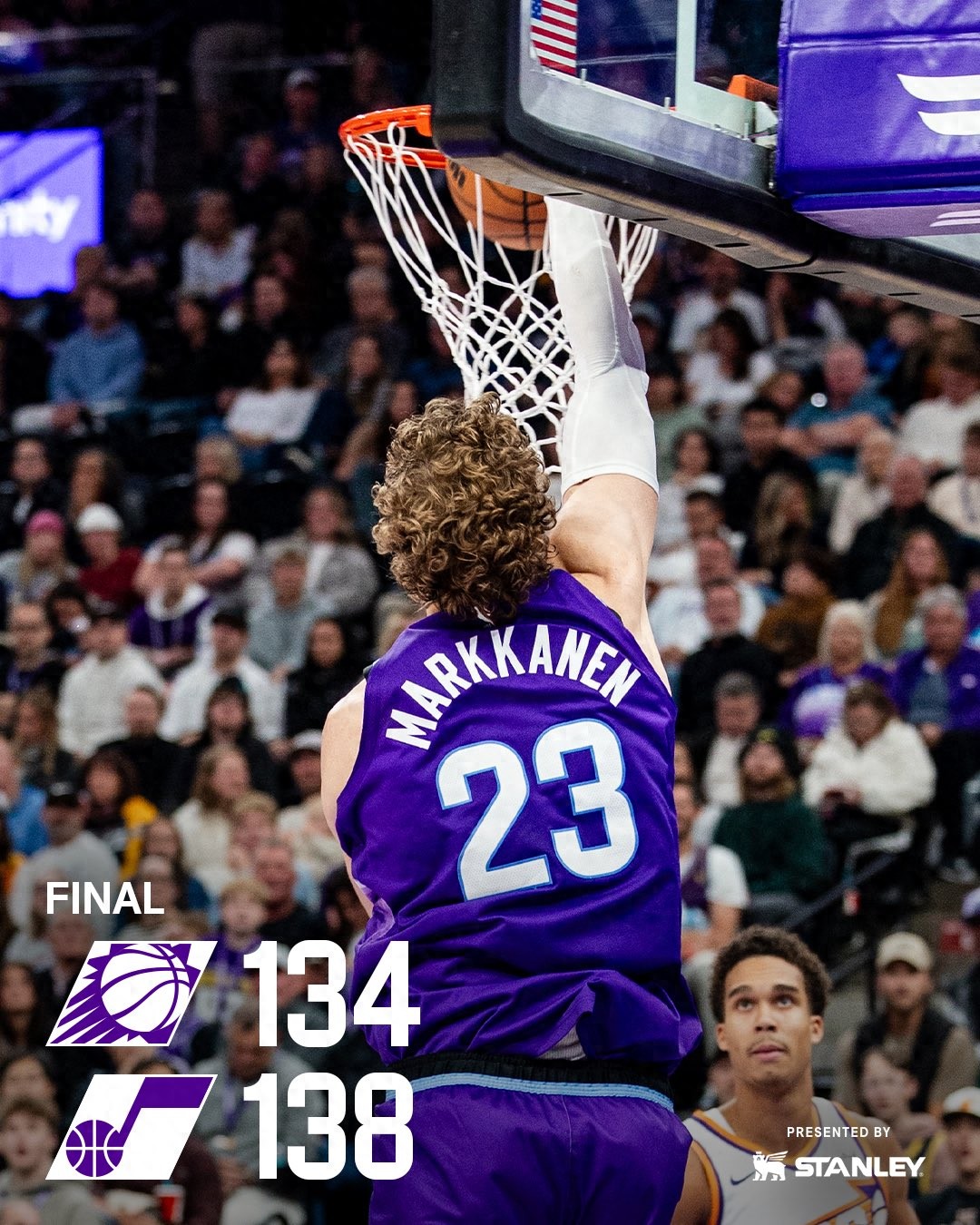 劳里-马尔卡宁32投14中,三分13中6,罚球17中17得到51分14个篮板3次助攻,仅1次失误。这是爵士队史自1998年来第一个50分。凯斯勒12投9中得到25分11个篮板4次助攻4次封盖,基扬特-乔治得到26分10次助攻,米哈伊柳克11分3助攻4次抢断。
