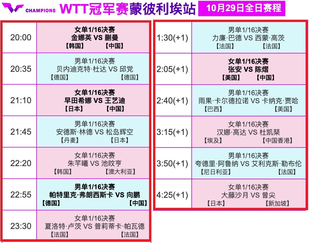 10月29日央视预告,WTT蒙彼利埃冠军赛蒯曼王艺迪向鹏出战
