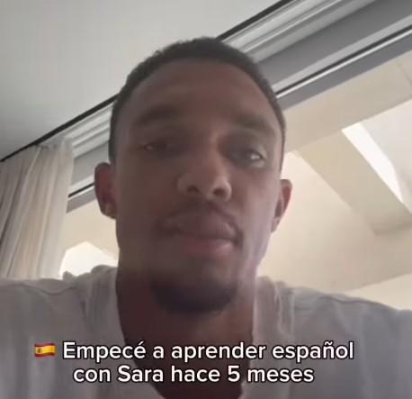 在Sara Duque晒出的视频中,阿诺德先是用英语说:“我和Sara从五个月前开始学习西语,因为我想更好地与我的队友、教练、球迷沟通,并适应当地的文化。”