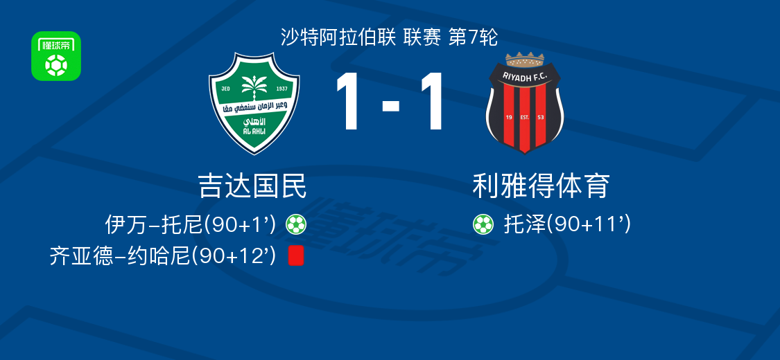 吉达国民1-1利雅得体育,伊万-托尼打破僵局,托泽救主