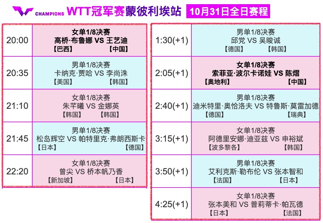2025年10月31日,WTT蒙彼利埃冠军赛,国乒7人仅剩 王艺迪 和 陈熠 。央视晚间八点有直播。
