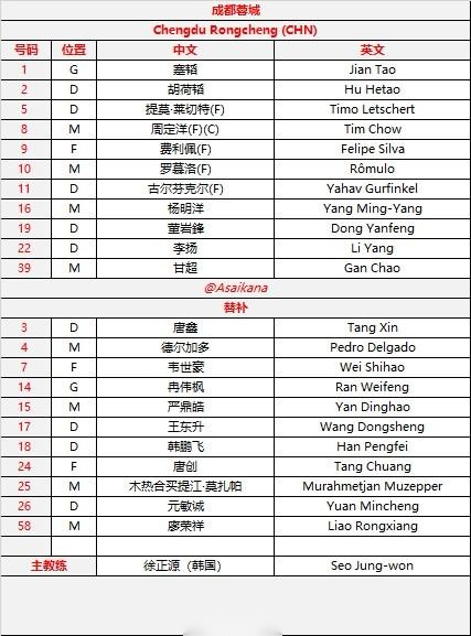 成都客战首尔:成都全主力出战,林加德首发,韦世豪替补