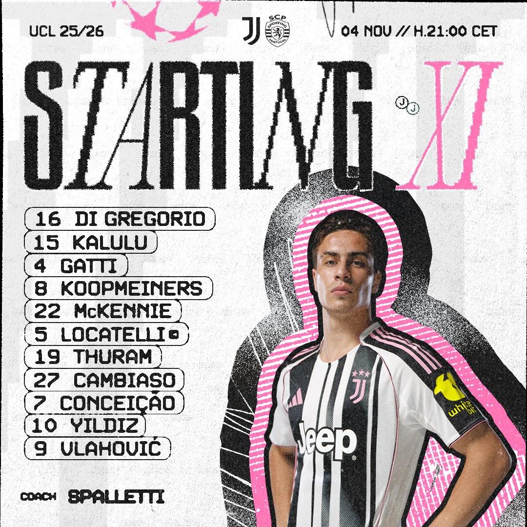 尤文首发: 16-迪格雷戈里奥、15-卡卢卢、4-加蒂、8-库普梅纳斯、5-洛卡特利、27-坎比亚索、19-凯夫伦-图拉姆、22-麦肯尼、7-孔塞桑、10-伊尔迪兹、9-弗拉霍维奇