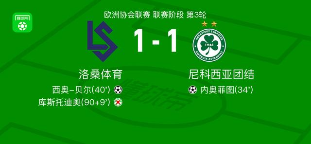 北京时间11月7日,欧洲协会联赛联赛阶段第3轮,洛桑体育与尼科西亚团结 对决。比赛中,尼科西亚团结率先打破僵局,迪翁库送出助攻,内奥菲图将球送入对方网窝。随后洛桑体育迅速做出回应,索佩精准传球帮助西奥-贝尔完成破门,将比分扳平。下半场补时阶段,洛桑体育获得点球机会,但库斯托迪奥主罚未能命中。最终双方以1比1握手言和。
