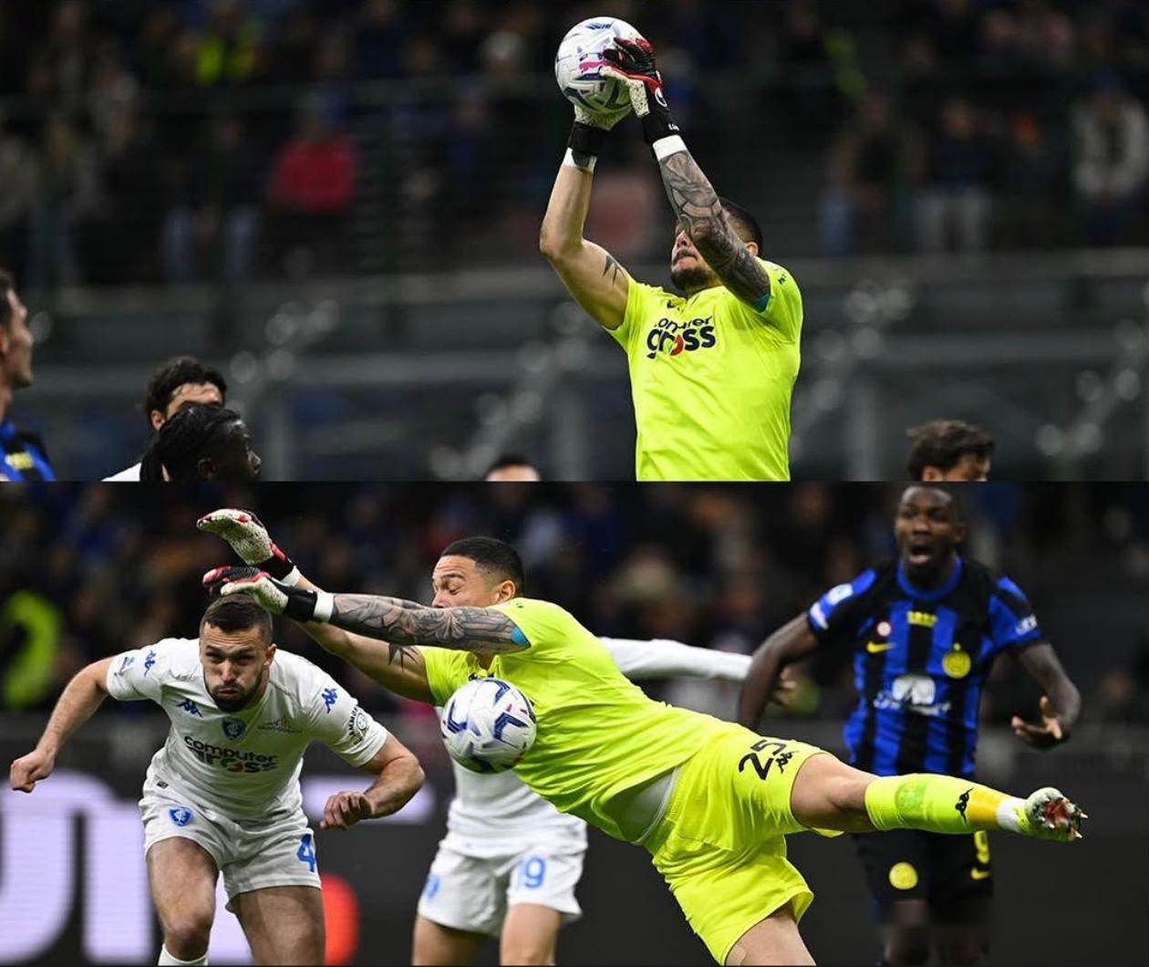 他加盟国米第一个赛季(2022-23赛季),98次被射正,扑救78次,扑救成功率是82.7%。