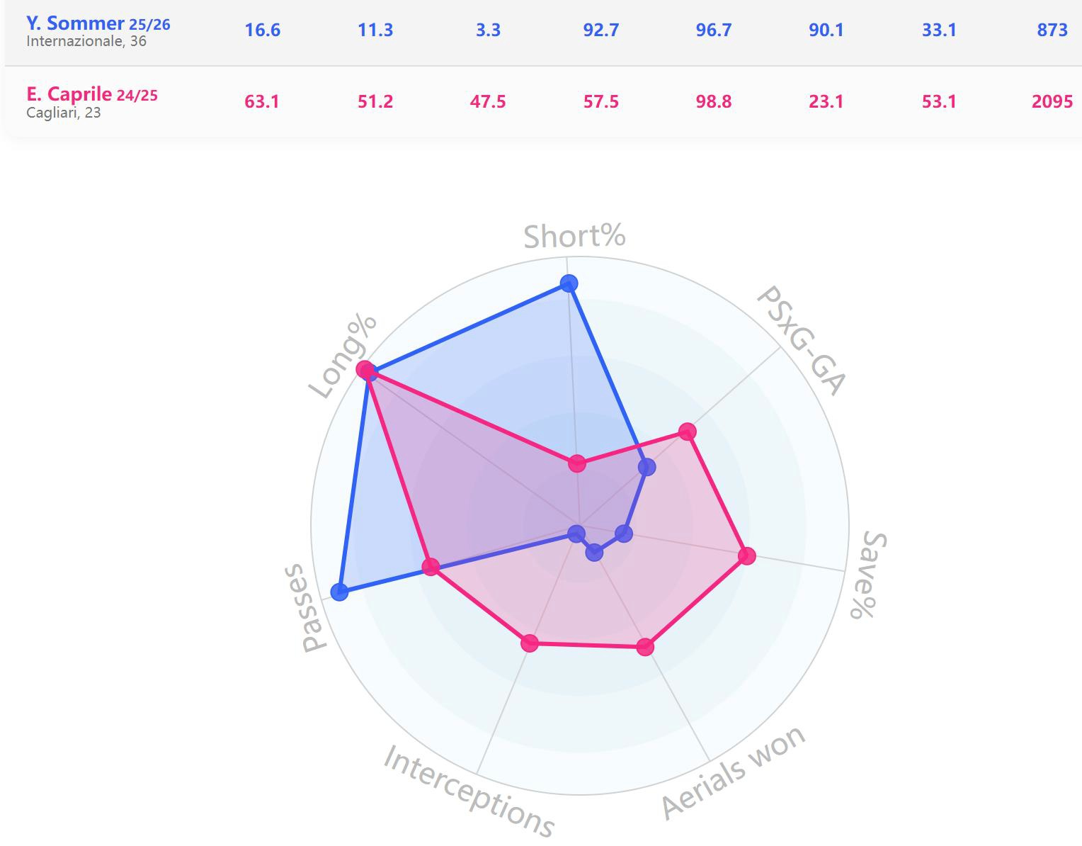 综上,卡普里莱是一个处理高空球能力强、选位意识好、扑点球能力强的门将。刚刚在意甲冒头不久的年轻门将,与索默相比,显然经验不足;但他的身材、臂展更具优势,处理高球和点球能力更强,也是显而易见的。