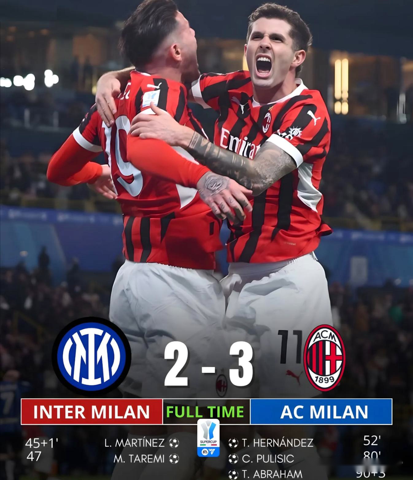 另一场是上赛季的意大利超级杯决赛,国米一度2-0领先米兰,但红黑军凭借特奥、普利西奇和亚伯拉罕的进球,3-2逆转夺冠。