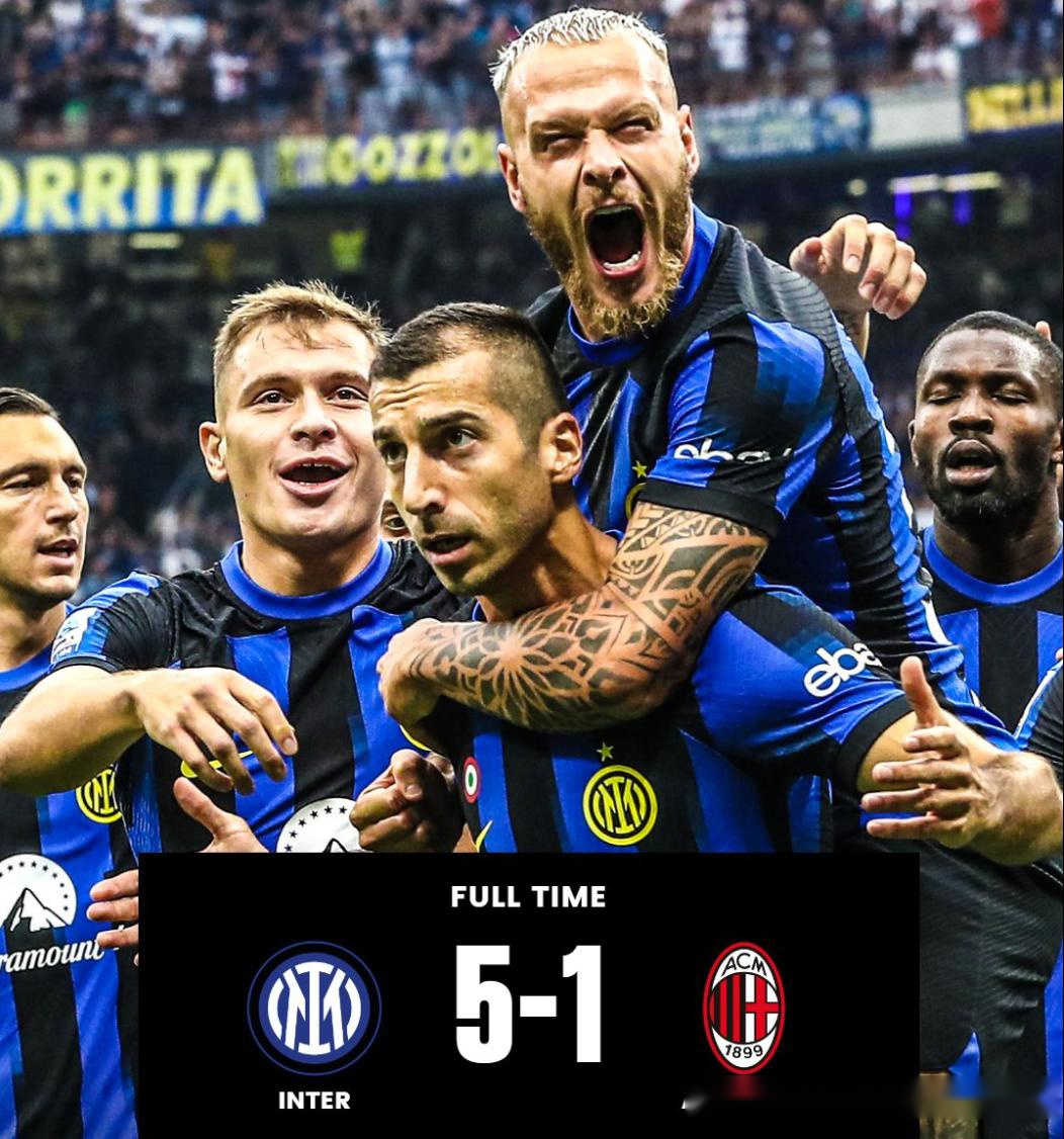 一场是2023年9月,当赛季意甲第4轮,国米凭借姆希塔良、图拉姆、恰尔汗奥卢、弗拉泰西等人的进球,5-1大胜红黑军。