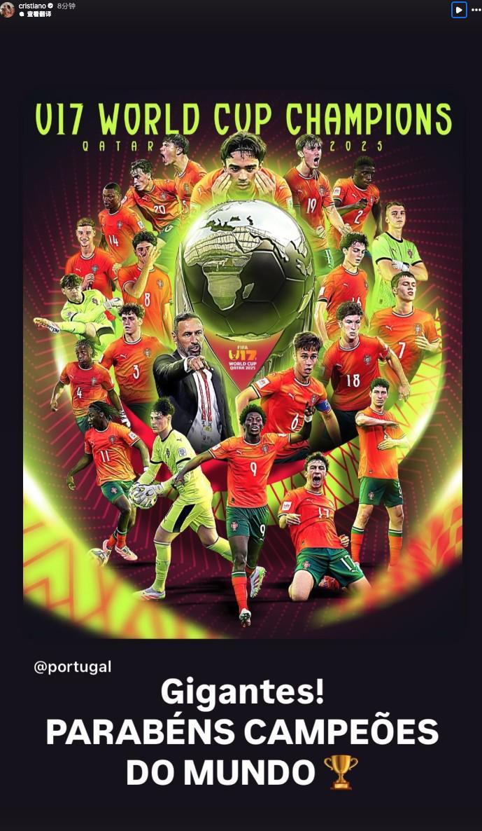在葡萄牙队首次夺得U17世界杯冠军后,C罗在社交媒体送上祝贺。