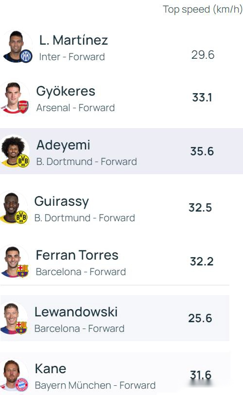 阿森纳的哲凯赖什是33.1公里/小时。多特蒙德的吉拉西是32.5。巴萨的费兰·托雷斯是32.2。拜仁的凯恩是31.6。切尔西的内托是34.9。利物浦的埃基蒂克是34.9,伊萨克是31.3。曼城的哈兰德(33.3),那不勒斯的霍伊伦(34.3)、卢卡(33.5),尤文的弗拉霍维奇(34.3)等人也都排位靠前。姆巴佩等人,就更不必说了。