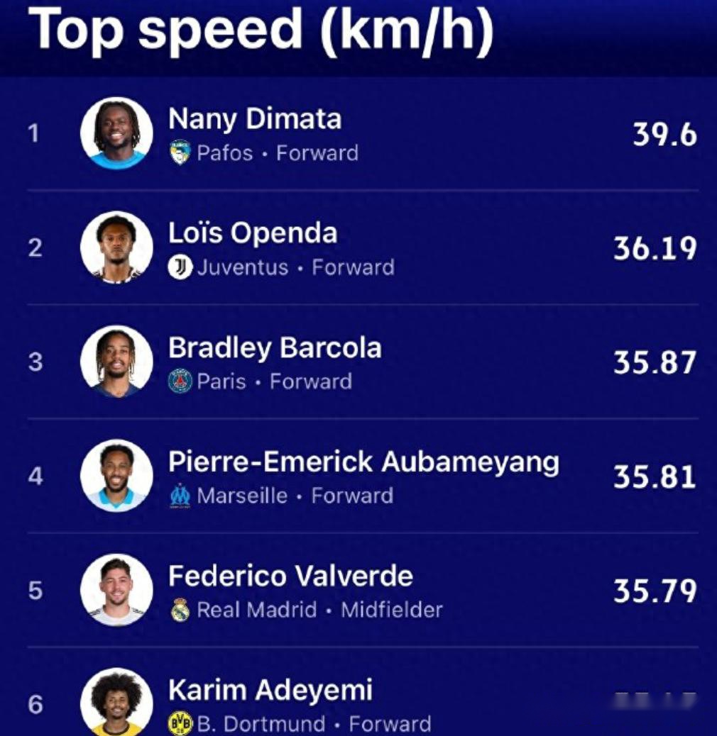 在速度榜单上,迪马塔以39.6公里/小时排名第一,尤文锋霸奥蓬达以36.19公里/小时排名第二,在榜单前列,还有大巴黎的巴尔科拉,皇马的巴尔韦德,多特蒙德的阿德耶米,利物浦的弗林蓬等人。
