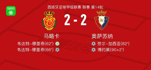 北京时间11月29日西班牙足球甲级联赛 联赛 第14轮,马略卡主场对阵奥萨苏纳。马略卡韦达特-穆里奇梅开二度。奥萨苏纳劳尔-加西亚破门,博约莫破门。最终比分马略卡 2-2 奥萨苏纳。