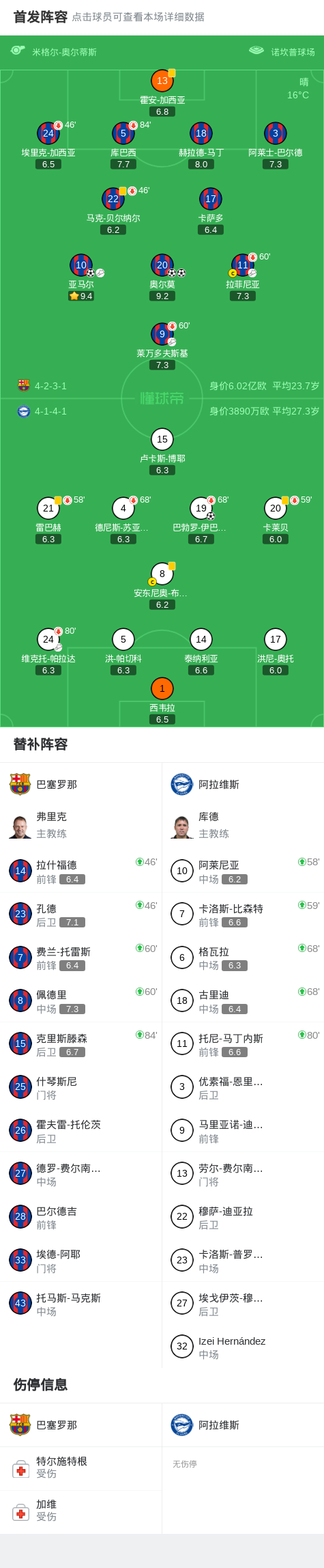 第26分钟,拉菲尼亚助攻奥尔莫破门,巴萨2-1反超阿拉维斯