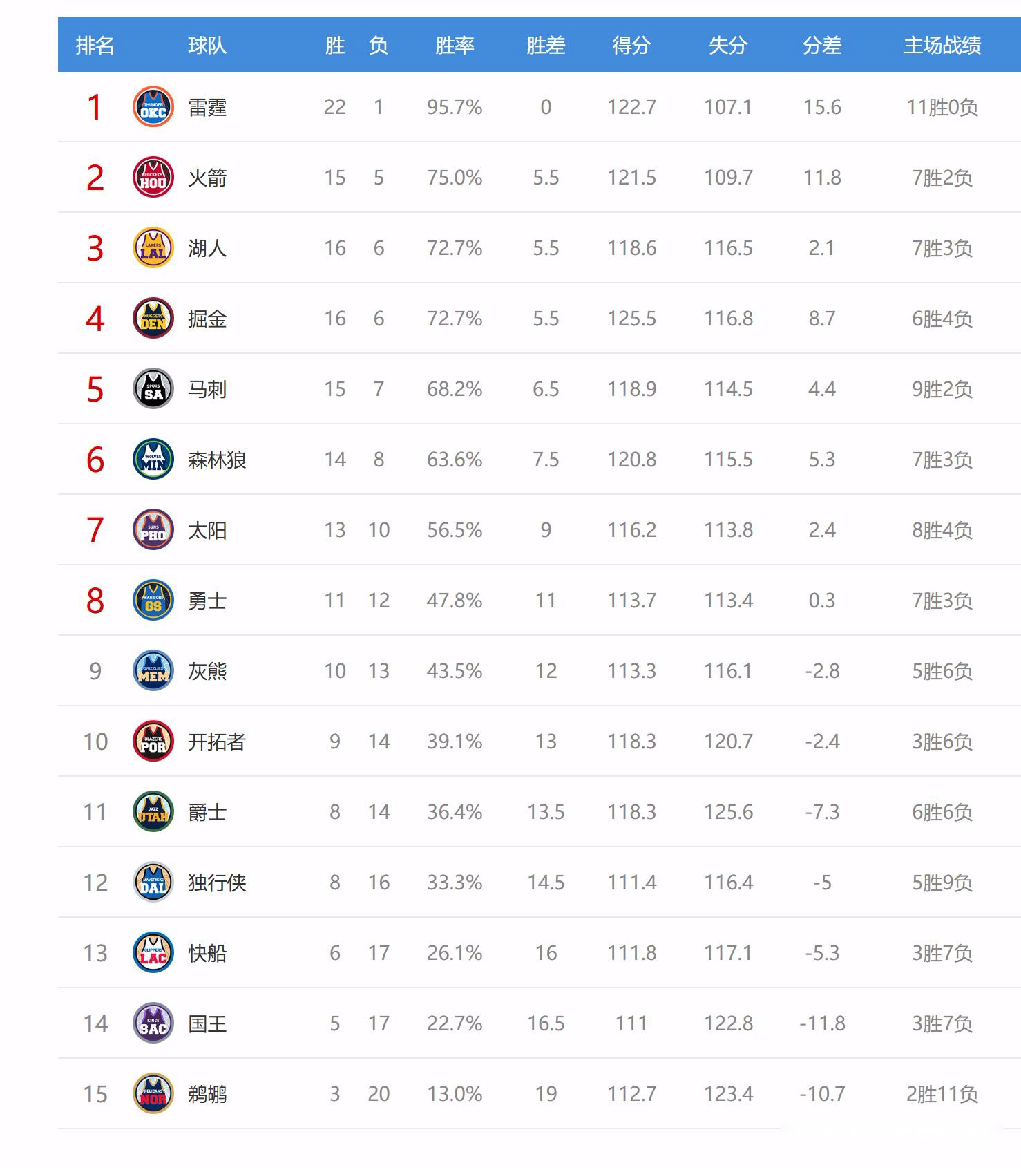 今日比赛后火箭、湖人排名互换,马刺、掘金排名互换,其他西部球队排名不变。