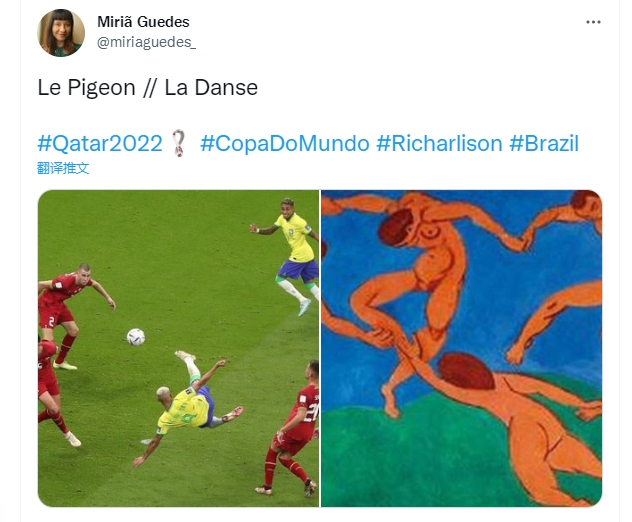 五星巴西登场迎来本届世界杯首秀,巴西2-0战胜塞尔维亚,理查利森双响,攻入了一记超级侧钩惊艳世界球迷。来看看国外球迷、媒体账号是怎么说的吧~