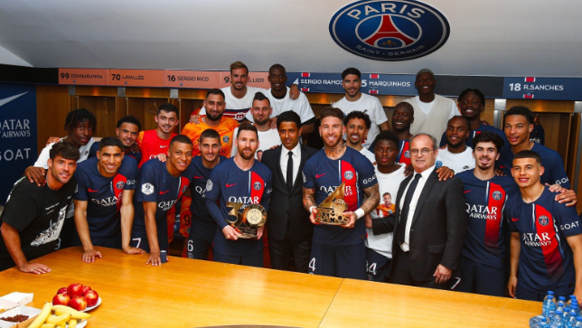 出了梅西之外,传奇拉莫斯也结束了两年的大巴黎生涯,俱乐部主席纳赛尔为首的球队高层在赛后来到更衣室,与即将离队的梅西和拉莫斯握手致意,向他们颁发纪念品后一同合影留念。可以看到一旁的姆巴佩笑得很开心,拉莫斯和梅西也露出微笑,这也将是两人最后一次以大巴黎球员的身份出现在主场更衣室,赛季结束,两大传奇离开。