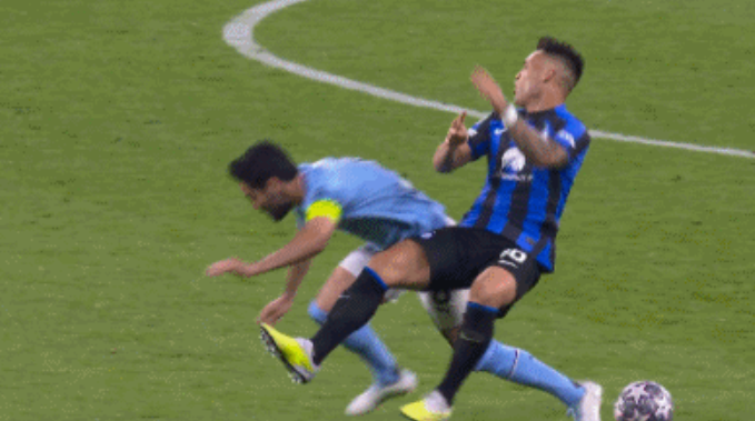 第52分钟,京多安从身后抢断劳塔罗,并未碰到球,裁判未吹罚犯规。紧接着曼城反击,裁判吹了达米安对格拉利什犯规,引发争议;