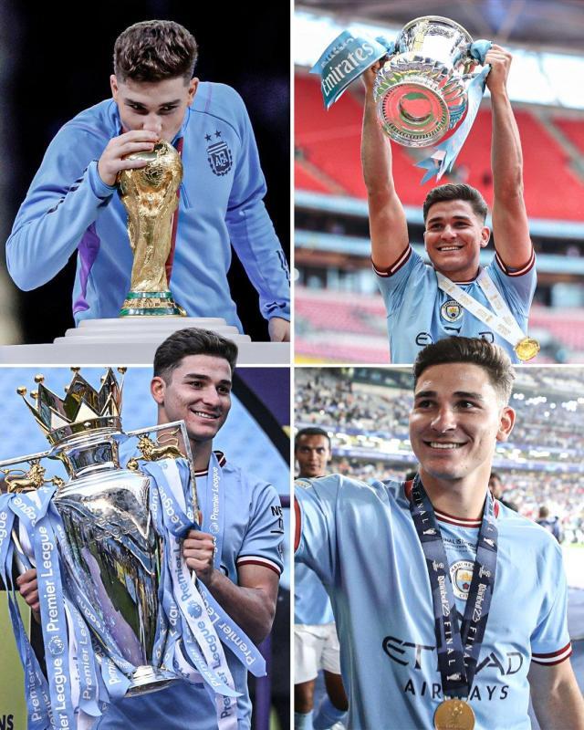 【12】胡利安·阿尔瓦雷斯虽然决赛未能出场,但他成为历史第12位单赛季同获欧冠和世界杯冠军荣誉的球员,也是阿根廷首人。前11人中8位来自德国:贝肯鲍尔、布雷特纳、赫内斯、卡佩尔曼、迈尔、穆勒、施瓦岑贝克(均为1974年,拜仁),另有赫迪拉(2014年,皇马)。还有2人来自法国:卡伦布(1998、皇马)、瓦拉内(2018、皇马)。另有一位则是卡洛斯(2002、皇马)。但“小蜘蛛”是迄今为止唯一一位在同一赛季既在俱乐部层面获得三冠王荣誉、又在国家队层面赢得世界杯的球员。
