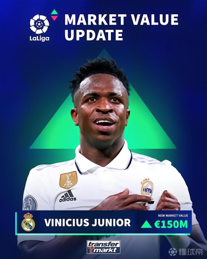 上涨身价最多的球员是维尼修斯,这位皇马边锋的身价从1.2亿欧上涨至1.5亿欧,世界足坛仅次于姆巴佩(1.8亿欧)和哈兰德(1.7亿欧),领先他的未来队友贝林厄姆(1.2亿欧)。