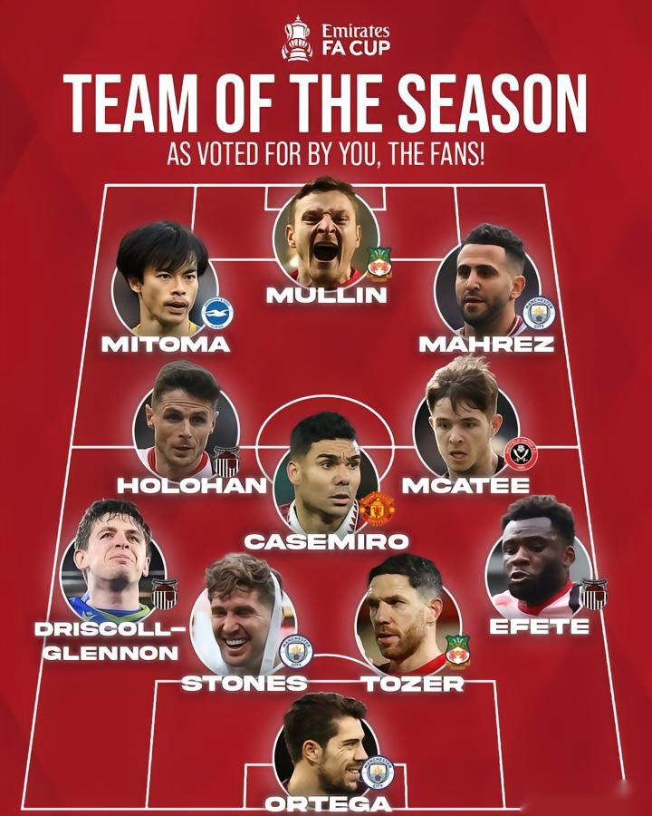 北京时间2023年6月16日,英格兰足总杯官方社交媒体公布了球迷票选的足总杯赛季最佳阵容,布莱顿的日本球员三笘薰入选,曼城则有三人在列。