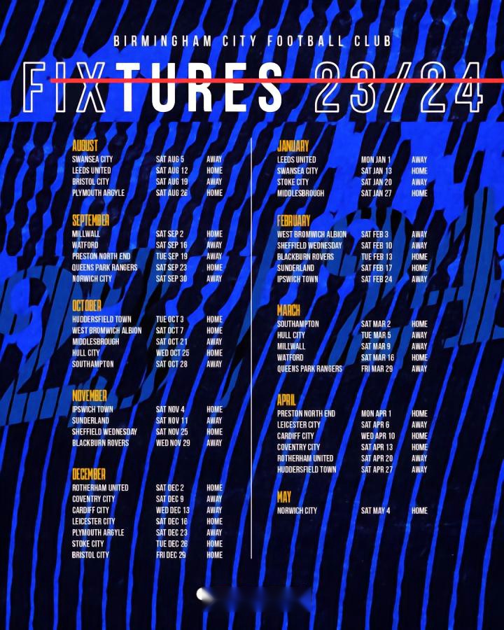 北京时间昨日下午,2023-24英冠赛程正式出炉,伯明翰官方也发布了新赛季完全赛程图。伯明翰在揭幕战中将做客对阵斯旺西,首个主场对阵“降班马”利兹联,赛季收官战将主场对阵诺维奇。