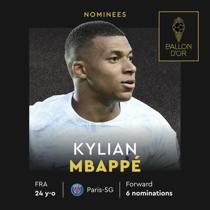 基利安·姆巴佩职业生涯第6次获得金球奖提名。