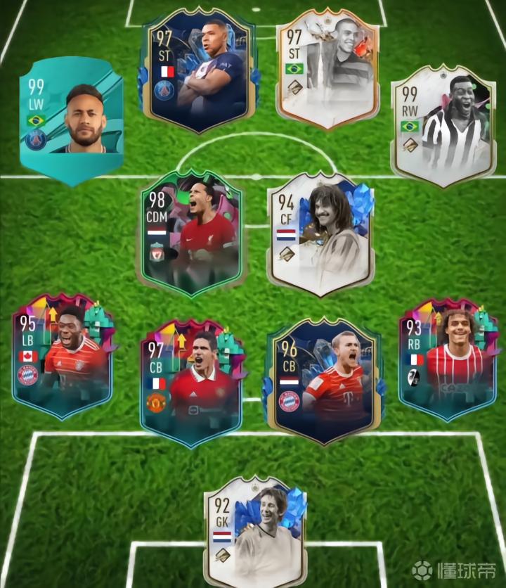 新一代游戏EA FC24即将发布,近日,内马尔的FIFA23UT阵容被公布。内马尔使用自己99总评的特殊卡打左边锋,前锋是姆巴佩与大罗,右边锋是巴西传奇贝利,中场分别是变异卡范戴克与古利特,后卫线从左至右分别是阿方索-戴维斯、瓦拉内、德利赫特与弗赖堡的西尔迪利亚,门将是范德萨。