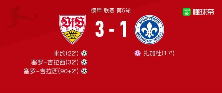 斯图加特vs达姆施塔特98球员评分:塞罗-吉拉西9.3分,鲁奥5.6分