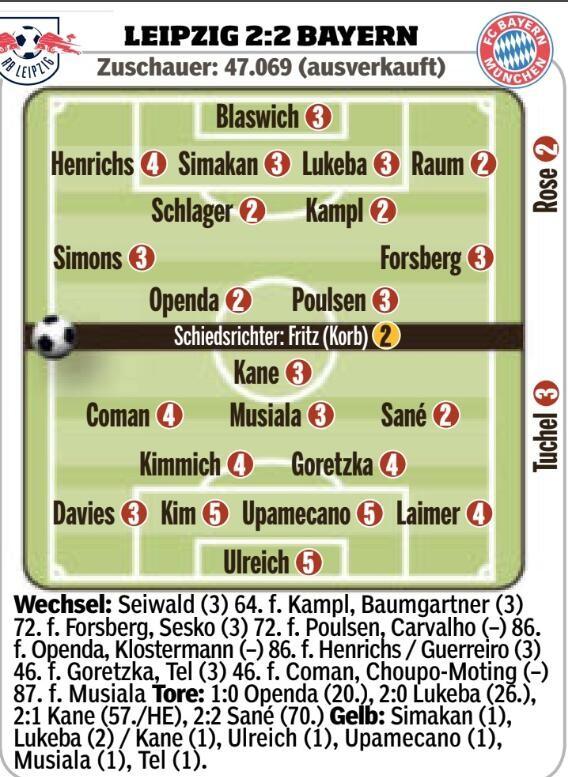 在今天凌晨结束的一场德甲关键战中,莱比锡主场2-2踢平拜仁慕尼黑。在赛后德国媒体《图片报》的评分中,莱比锡球员奥蓬达、坎普尔和施拉格尔等球员得到高分,拜仁方面萨内得到高分,于帕梅卡诺和金玟哉得到低分。