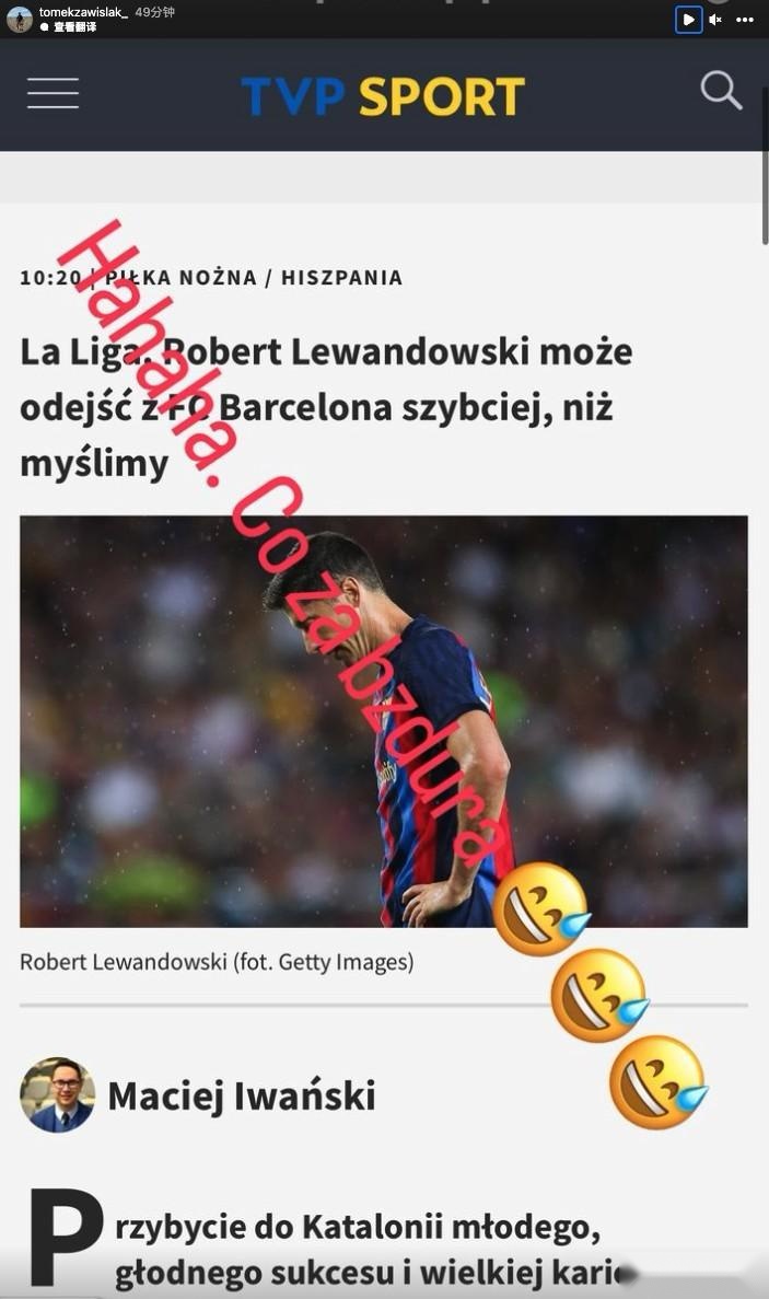 对此,莱万好友Tomek Zawiślak在社交媒体晒出相关报道截图,配文:“哈哈哈,胡说八道。”并配上三个流汗表情。